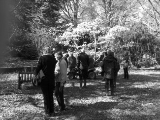 Mr Holman led us past a tall hedge of Myrtus luma, the cinnamon-coloured trunks beautiful in the sunshine to a clearing in which stood a tall and graceful Pinus butanicus, currently thought to be the tallest in the country. We walked through thickets of many camellias with their seedlings pushing up through the rich leaf mould and more pines originating from the Edinburgh Botanical Gardens. The magnolias which had grown into towering trees were sadly burnt by an unwelcome late frost, but specimens of Magnolia stellata were gloriously untouched.