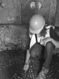 After careful work scraping at the decades of grime, the original star pattern begins to emerge on the grotto floor.