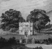 The editor remembers the house, a complete square, with a superb barbican in front, united to the house, or rather castle, by two lofty walls. These walls were first taken down, and then the front, by Mr George Hunt, which he replaced by green palisades.[25]