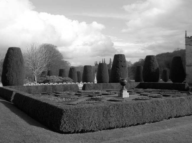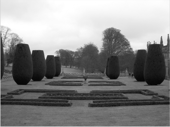 Photographic evidence gives a clear indication that the style of planting adopted for the formal gardens changed significantly during the course of the late 19th and early 20th century. The one constant factor, which remains to the present, is the group of Irish yews (Taxus baccata ‘Fastigiata’) which are visible as young plants in photographs dating from the 1860s, and which were sufficiently mature in 1881 to be recorded on the 25-inch Ordnance Survey.