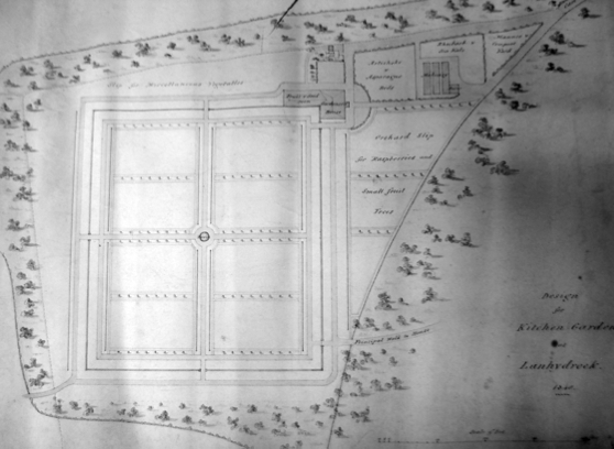 A design for a kitchen garden dated 1840 survives in the archive at Lanhydrock. This attractive watercolour plan is signed by William Booth, who can be identified as William Beattie Booth (c.1804-74), Head Gardener to Sir Charles Lemon [2] at Carclew, Cornwall, from 1830 to 1858.
