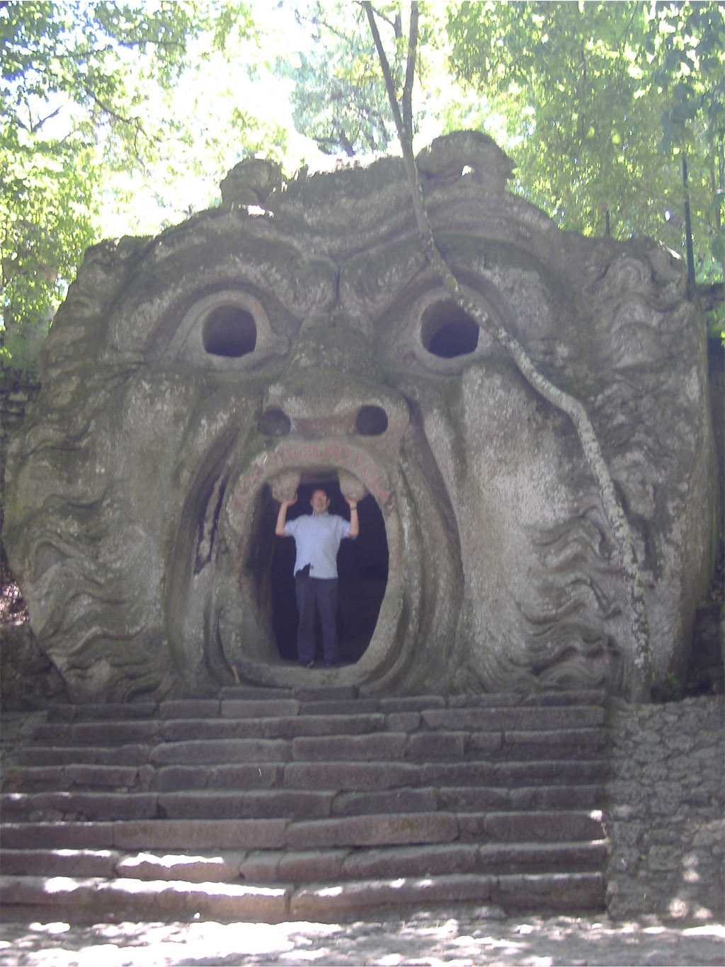 The difficulties of following a narrative imposed on a garden several centuries ago is to be experienced at Bomarzo, Viterbo, in the extraordinary so-called Sacro Bosco contrived in 1552 by Prince Vicino Orsini. Here huge statues hewn from living rock are to be encountered along a winding woodland path in some sort of abstruse allegorical code. These ‘monsters’, as they are locally known, range from Pegasus, Venus and Ceres to a wide-mouthed ogre with seating inside its maw, giants, Harpies and an array of grotesque animals such as lions, dragons and an impressive war elephant complete with a tower on its back and a legionary caught in its trunk. This idea of art as deceit is at its most disturbing in the Leaning House where visitors lose their equilibrium as they walk across the tilting floor. In fact, a telling inscription in the garden invites the visitor to decide whether the marvels within are made for deceit or art …another aspect of the Renaissance debate of Art versus Nature. Here amidst the contorted and disturbing figures, Nature seems to have lost out! But that, too, is a mere deceit as Nature is omni-present in the somewhat sinister woodland setting in which this bizarre fantasy is staged and where the normal idiom of a conventionally controlled and tended garden is subverted.