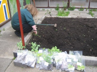 The garden club was aimed at years 7 and 8, the first two years of secondary school, so the students are aged between 11 and 13 years old. Eight to ten students signed up for the club, but as attendance is voluntary, not everyone turned up every week. By March one of the areas was prepared for planting, and this is where we came in. Cornwall Gardens Trust sponsored, with the support of Fentongollen, a large box of vegetable plug plants. Plug plants are ideal as they have a far higher success rate than growing plants from seed. This success is vitally important when trying to encourage young people to start growing.
