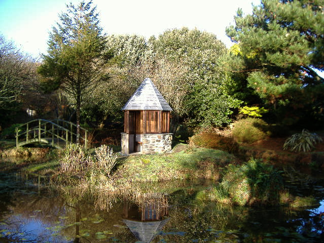 In April last year deep foundations were dug, then the base was built of serpentine, large rocks found about the garden, and in old serpentine quarries on the cliff. Next, wooden walls with four windows, and finally a slate roof with lead seams. Inside is a cedar seat, and we have cut a window in the trees at the bottom of the garden to allow a sea view.